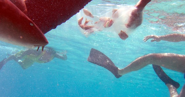 一、兩個男生跟船家要了幾片,也餵起這隻一百二十公分的鯊魚來,